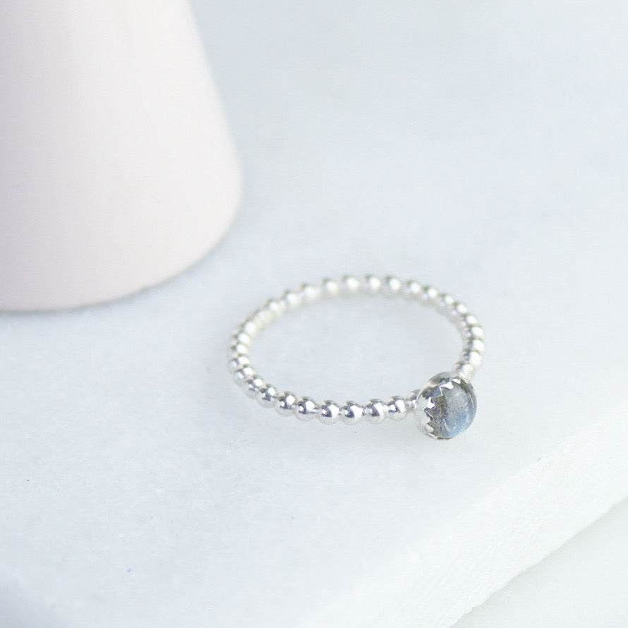 Labradorite gemstone (5mm) set in a serrated edge setting on a thicker beaded ring (2mm).